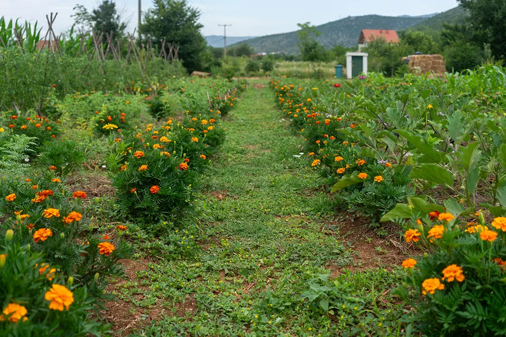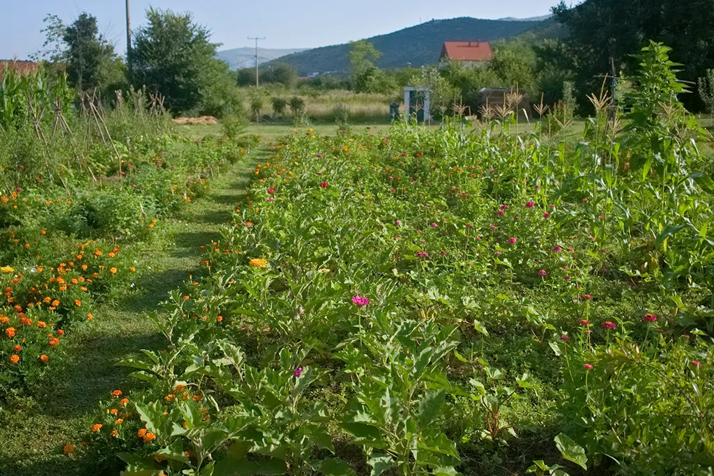 - The Sun Garden – polyculture rows alive with seasonal growthand colorful flowers
